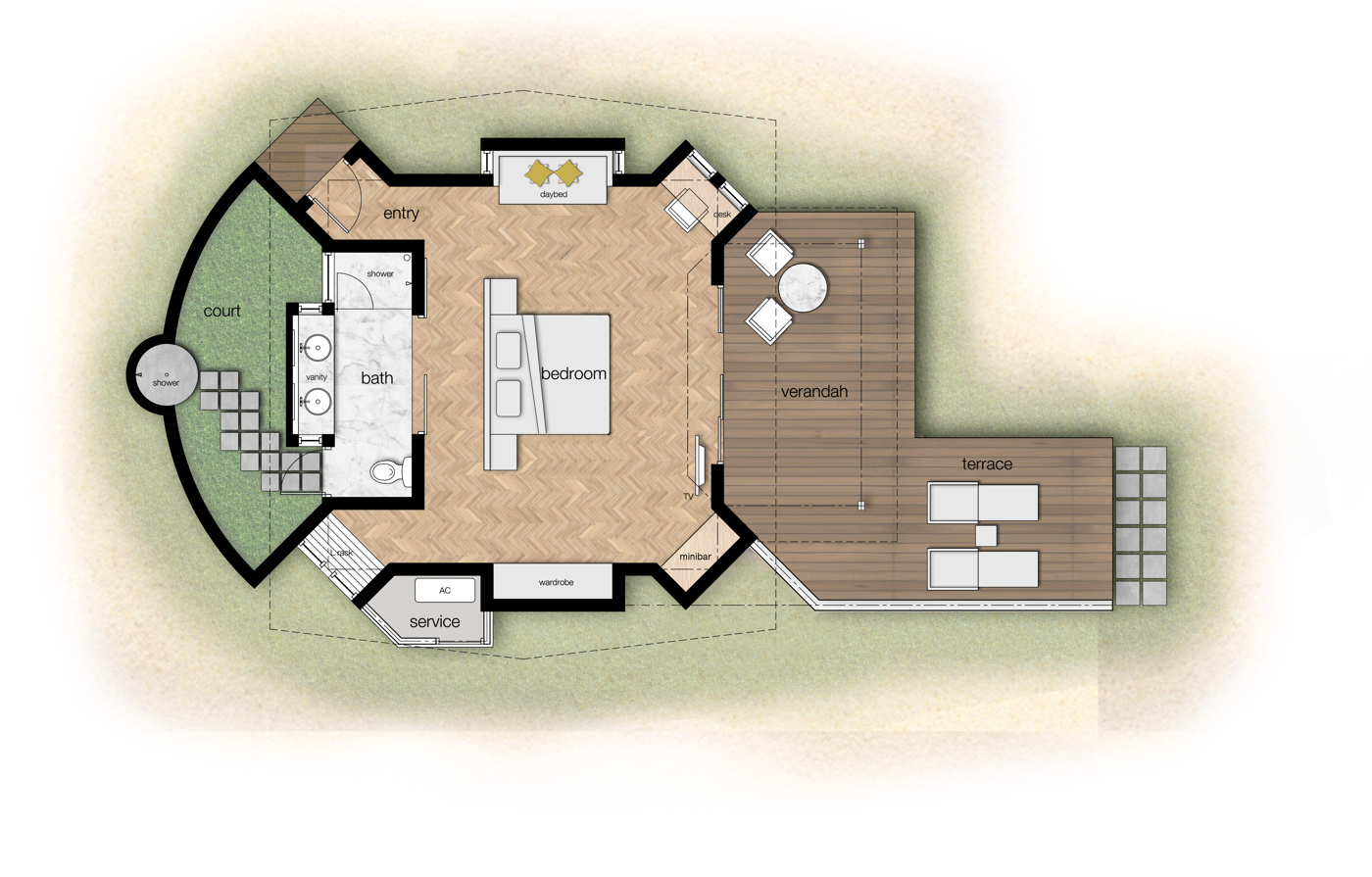 Площадь номера — 99 кв.м. Пляжные виллы с видом на море. Состоят из спальни с большой двуспальной кроватью, ванной комнаты полуоткрытого типа с ванной и душем, внутреннего садика с душем под открытым небом, террасы с зоной отдыха и шезлонгами. ПЛАН НОМЕРА